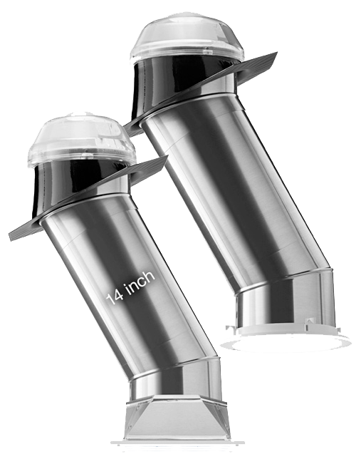 Delivers daylight and brilliant illumination to spaces up to 300 sq. ft, such as the kitchen, family room, master bath, and large entryways. Round and square diffuser options are available. Tube Size ≈ 14 in. (350 mm) Light Coverage Area ≈ 150-300 ft.² (23 – 28 m²) Potential Tube Length ≈ 30 ft. (9 m)